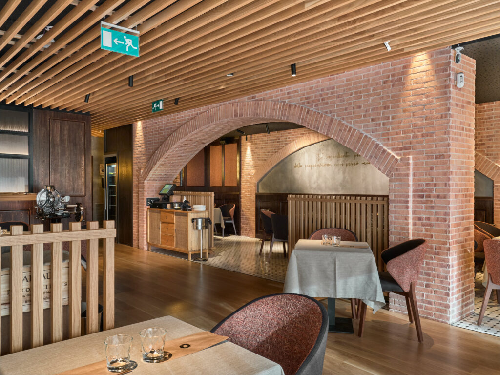 En esas circunstancias, la obra se ha logrado ejecutar tal y como estuvo proyectada desde el inicio en todas y cada una de las directrices decorativas marcadas por el afamado estudio de arquitectura Touza, encargados del diseño del restaurante. En el espacio de la sala, el objetivo de la creación de diferentes ambientes se ha conseguido a través de la combinación de materiales como el hierro, el vidrio listral, el micro cemento y el ladrillo.