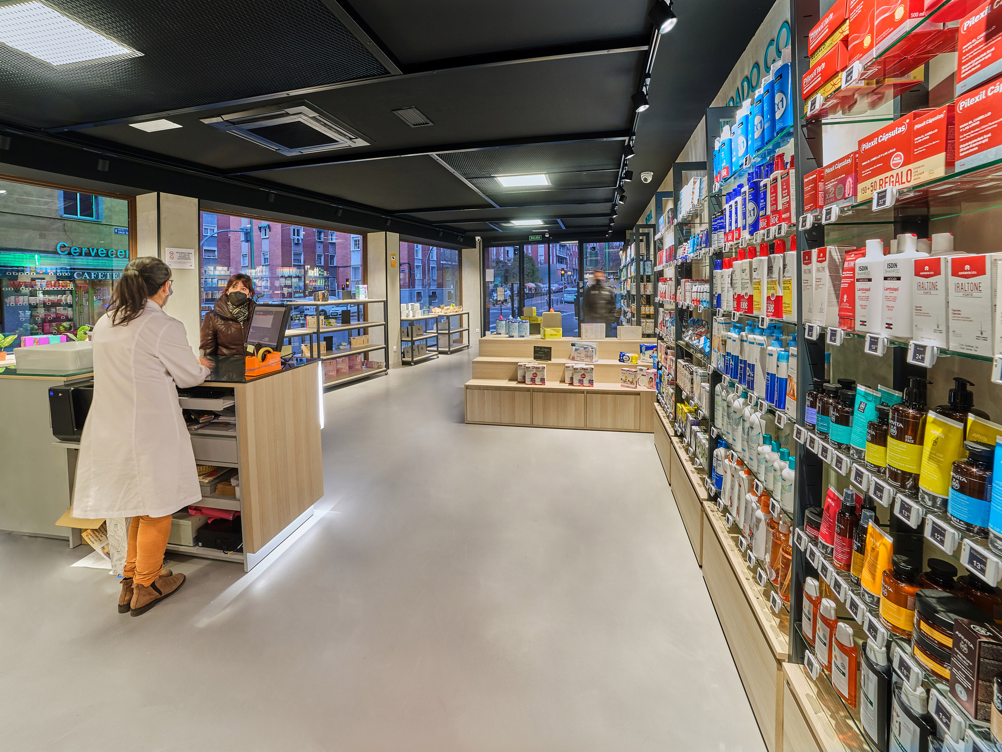 De inicio, la reforma presentaba dos grandes desafíos: por un lado, ampliar las instalaciones de la farmacia a través de la adhesión del local adyacente para crear un nuevo espacio de 130 m2. ; y, por el otro, realizar toda la reforma conviviendo con la actividad comercial de la farmacia en funcionamiento. Ambas circunstancias, a juzgar por el resultado final, fueron resueltas de manera muy satisfactoria.